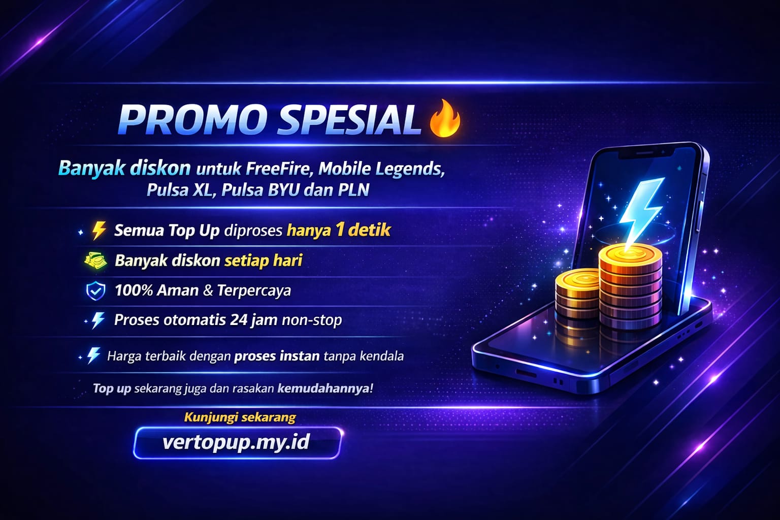 vertopup.my.id menyediakan berbagai layanan digital yang lengkap untuk memenuhi kebutuhan sehari-hari kamu. Dengan satu platform, kamu bisa mengakses berbagai jenis top up dengan mudah tanpa perlu berpindah tempat. Semua layanan tersedia dengan harga yang terjangkau serta proses yang cepat dan efisien.